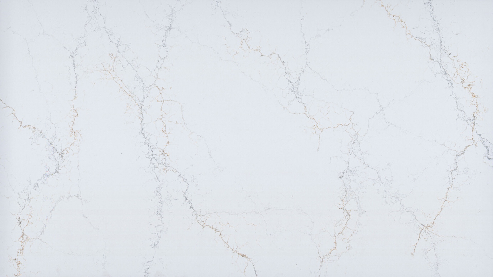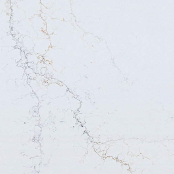 A dramatic marble-look quartz with a deep white background and bold, sweeping grey and gold veining. Nuevo Misterio Deluxe delivers a luxurious appearance while maintaining the strength and durability of engineered quartz.
